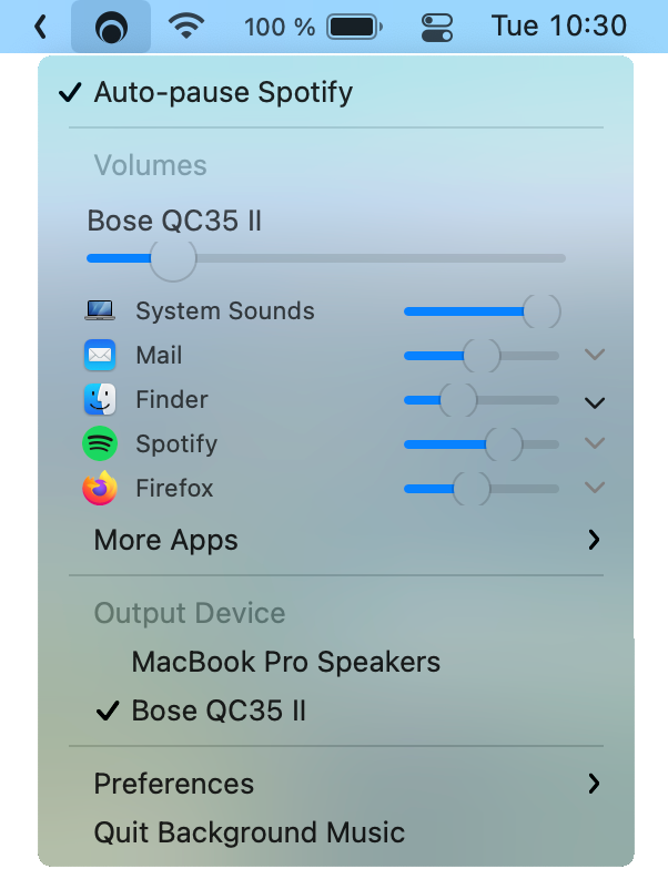Background Music automatically pauses your music player when a second audio source is playing and unpauses the player when the second source has stopped. This is useful if you want to listen to music while you’re using other apps, but don’t want to have to pause and unpause your music player every time you switch apps.