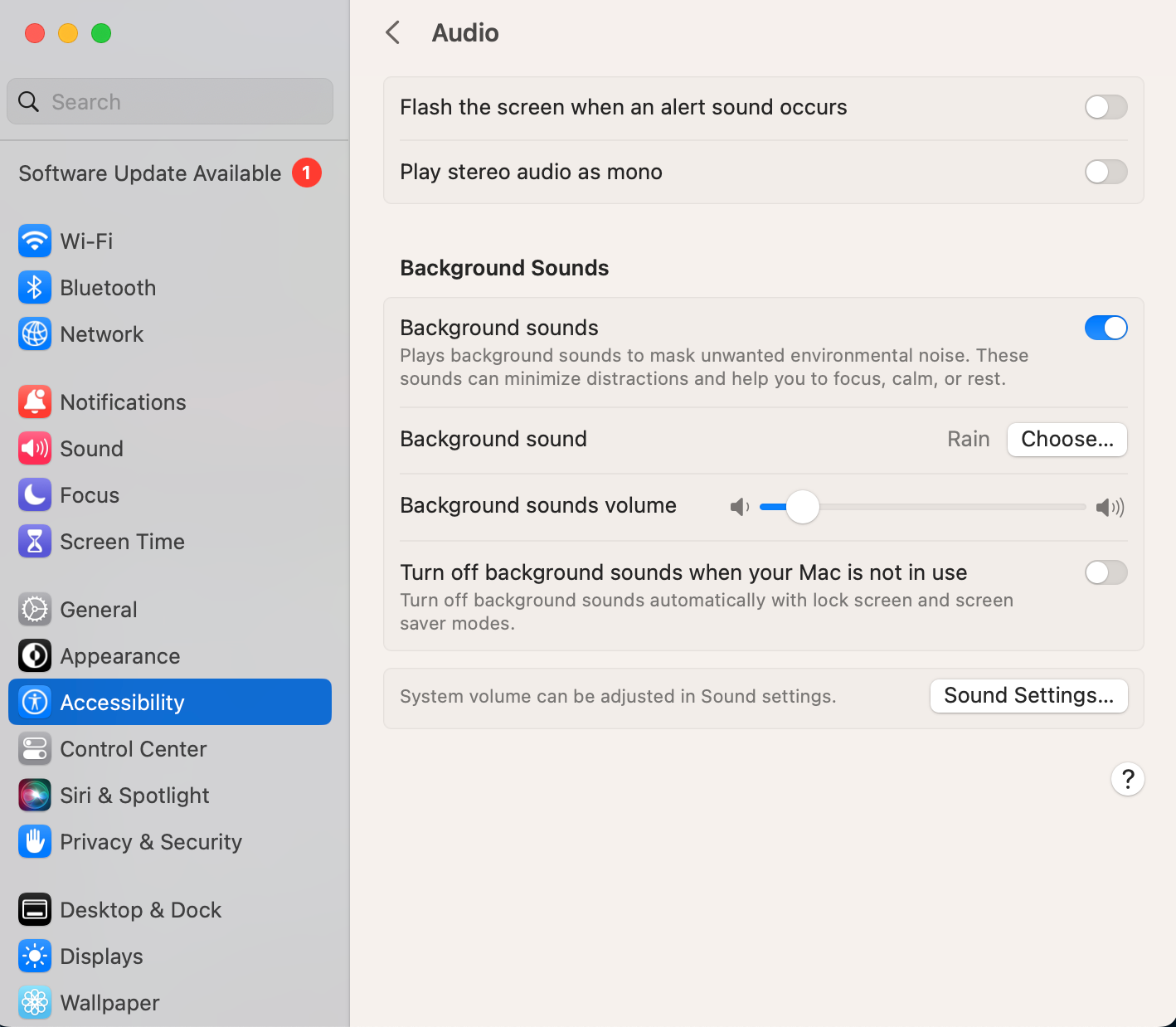 Before we start, you need to know that this feature is only available on Mac OS ventura and higher. If you are using an older version of Mac OS, please follow this article where we show you how to turn on background sound on Mac OS (for older version).